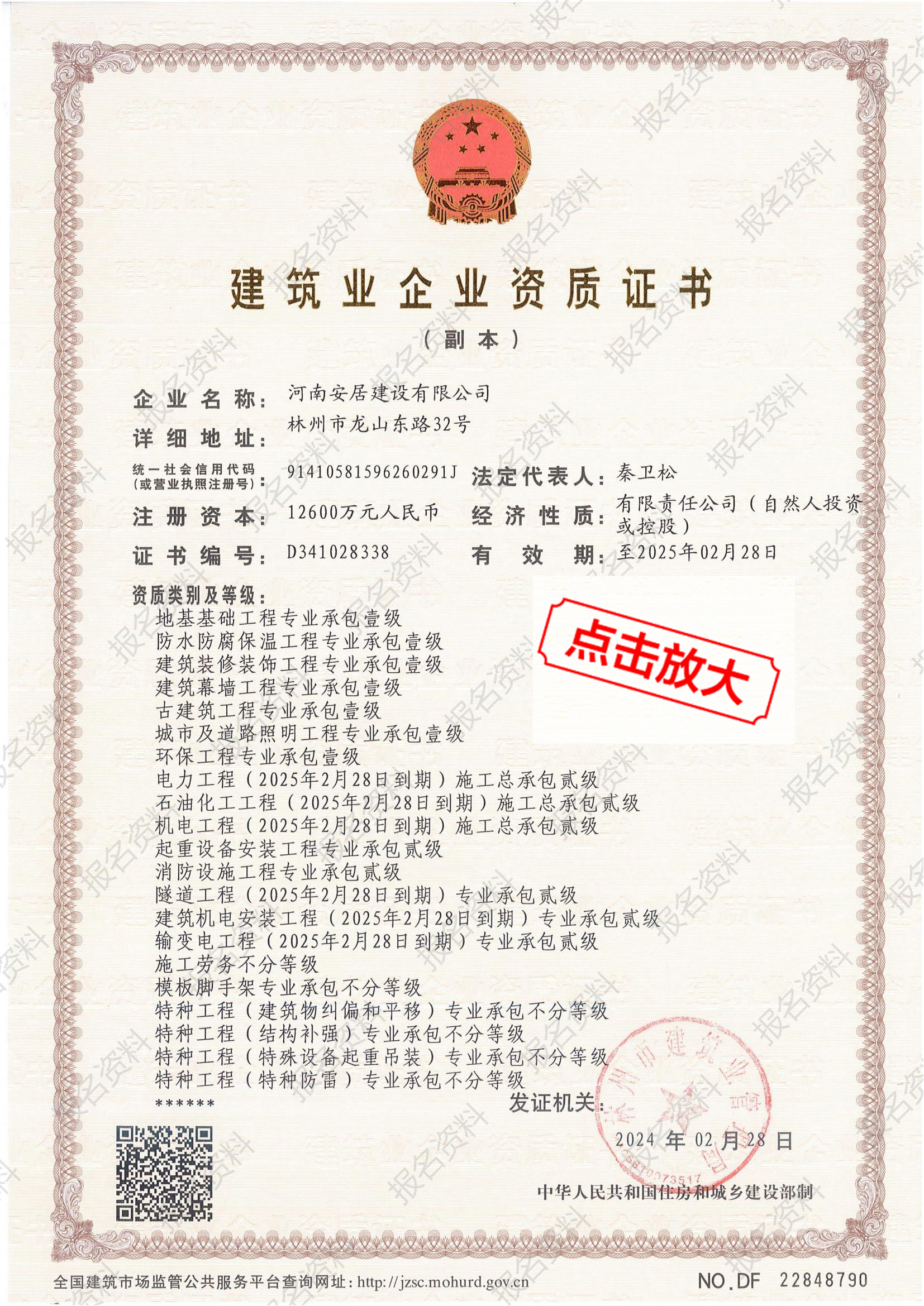 滔滔黃河哺育了中華民族拼搏向上的奮斗精神,巍巍太行造就了中原兒女的紅旗渠精神。百萬林州人下太行,鑄就了中國建筑之鄉響當當的耀眼品牌。河南安居建設有限公司從誕生起血液里就流淌著紅色基因,秉承“安得廣夏千萬間,大庇天下寒士俱歡顏”的擔當精神,用鋼筋混凝土筑起了高樓大廈,也用一流品質、家國情懷打造了安居建設的輝煌成績。公司成立于2012年,注冊資金12600萬元,公司成立至今,擁有建筑,市政施工總承包等十項一級資質;其他二級等資質共二十余項。公司秉承質量第一,服務為主,堅持垂直管理,從不設立分公司等分支機構。